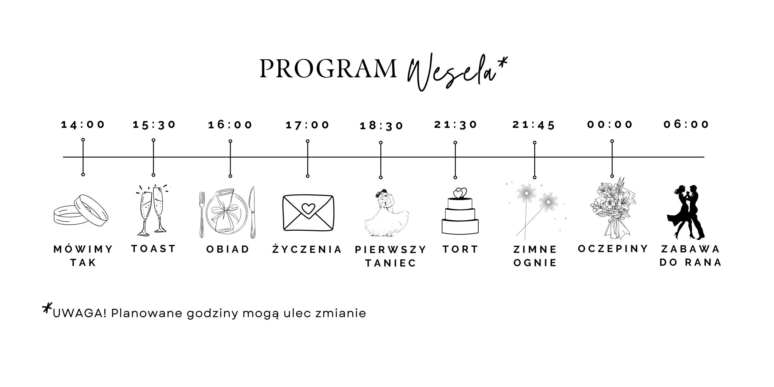 Abyście mogli cieszyć się każdą chwilą naszego wyjątkowego dnia, przygotowaliśmy krótki harmonogram najważniejszych momentów. Poniżej znajdziecie plan wesela – od wzruszającego „tak” aż po zabawę do białego rana!